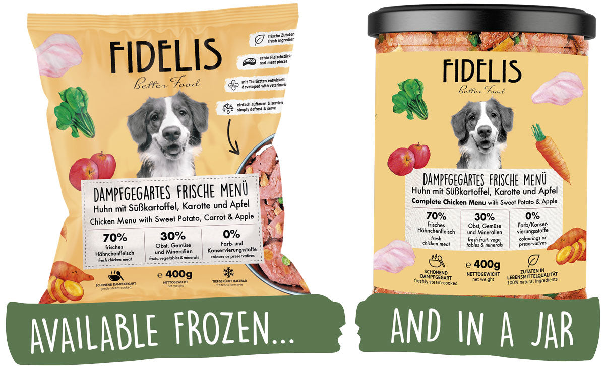 Claudia used to cook for her dog Wotan herself. Dry and canned food were too unhealthy for her, and Wotan didn’t tolerate BARF. The FIDELIS Fresh Menus look just as appetizing as Claudia’s home-cooked meals. In terms of price, they’re about the same — but considering the time spent shopping and cooking, FIDELIS Fresh Menus are clearly more affordable than cooking yourself.