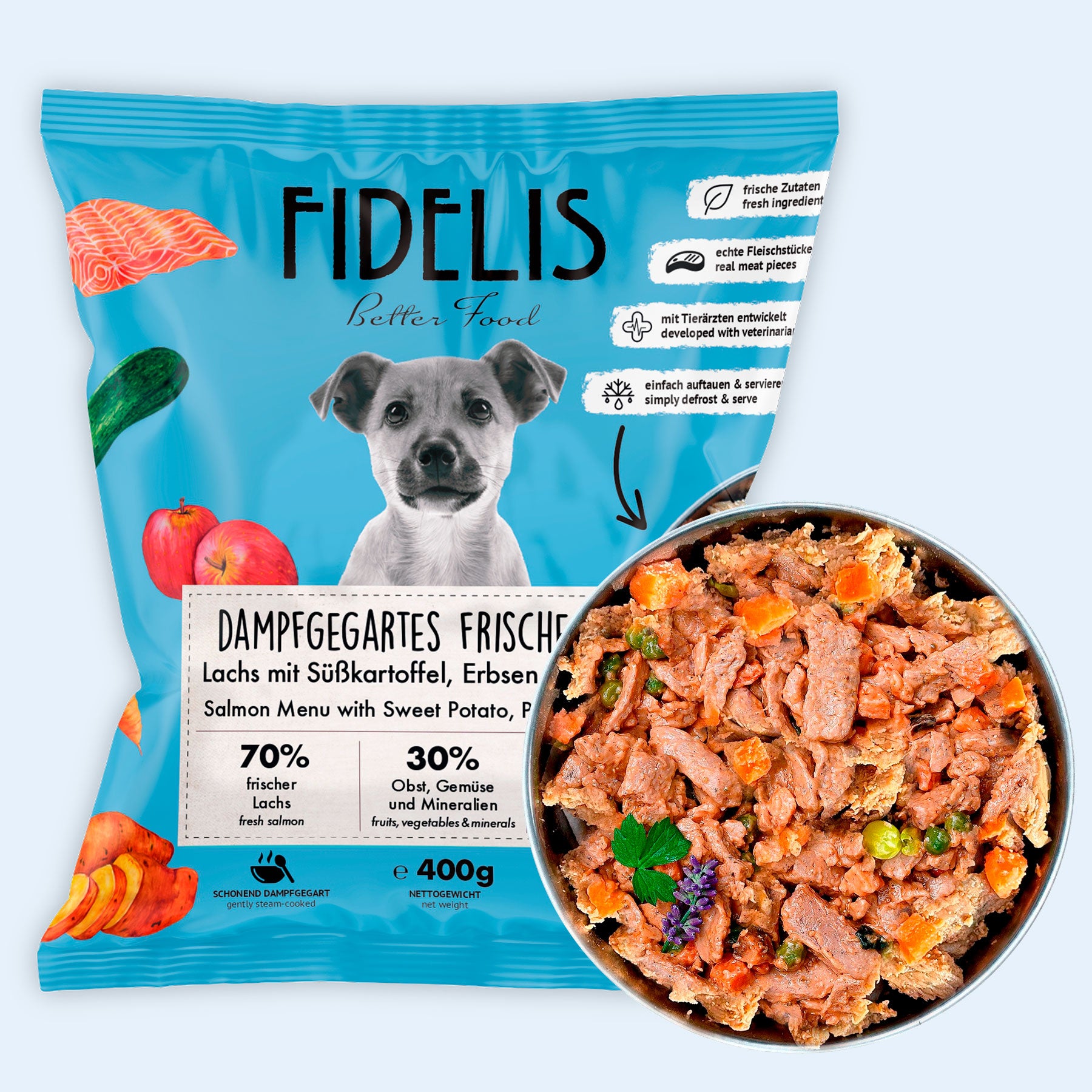 “No more digestive problems, itching, or paw licking – the FIDELIS frozen Fresh Menus provide your dog with high-quality ingredients, optimal digestibility, and all-natural nutrients for an active and healthy life. Thanks to gentle steam cooking followed by shock freezing, quality, flavor, and vitamins are perfectly preserved – completely without preservatives, flavor enhancers, or attractants. This way, your dog always gets a truly fresh and natural meal.”